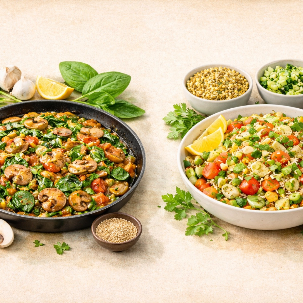 An ultra-low-carb and iron-rich lunch combo. Sautéed mushrooms with fresh spinach paired with a crunchy sprouted moong salad. Best for satisfying hunger without the guilt of carbs!